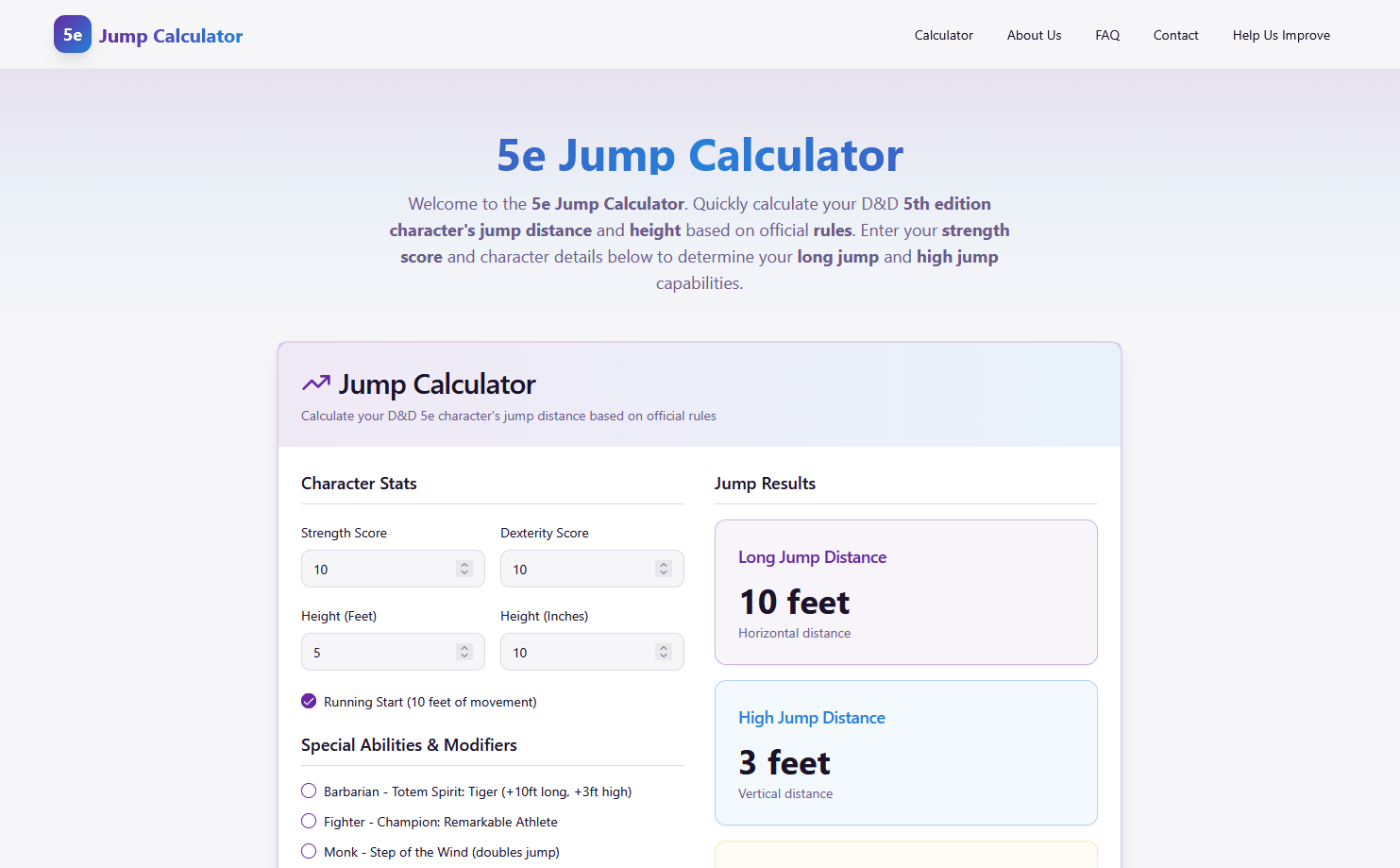You’ve found 5e Jump Calculator, a straightforward online tool created to fix a common D&D 5e table slowdown: jumping.